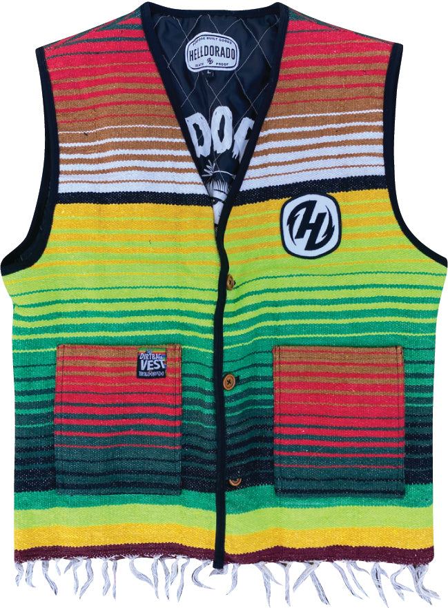 This is a must have! A complete custom garment designed from the ground up with no detail overlooked. The 1970's vintage inspired blanket material has style and comfort and the diamond stitched interior will give you chills, in a good way. We didn't overdo the padding, it's not too thick, we don't like it when there's too much and you look like a marshmallow. We added an interior stash pocket on this one! This vest has clean and classic lines and it'll only look cooler with some age to it. The wood buttons combine perfectly with this piece. We don't know where you would find this vest anywhere else but with Helldorado, we've got the goods and it's never mass produced so you know you have something special and will stand out in the crowd, that's the goal. Limited edition, grab it while you can!