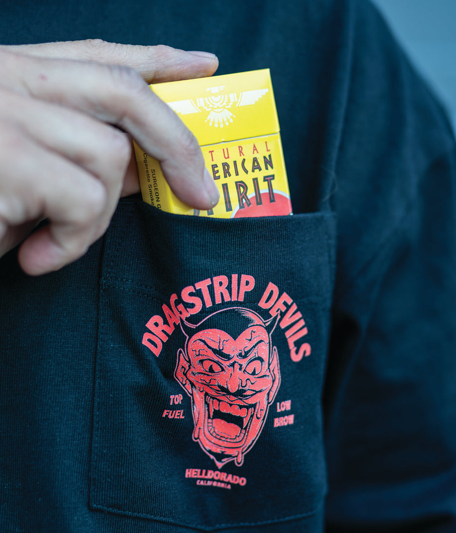 This design on this pocket long sleeve is a perfect match. The heavy weight feel of the shirt feels killer. Pocket tees are rad, useful and unique, perfection