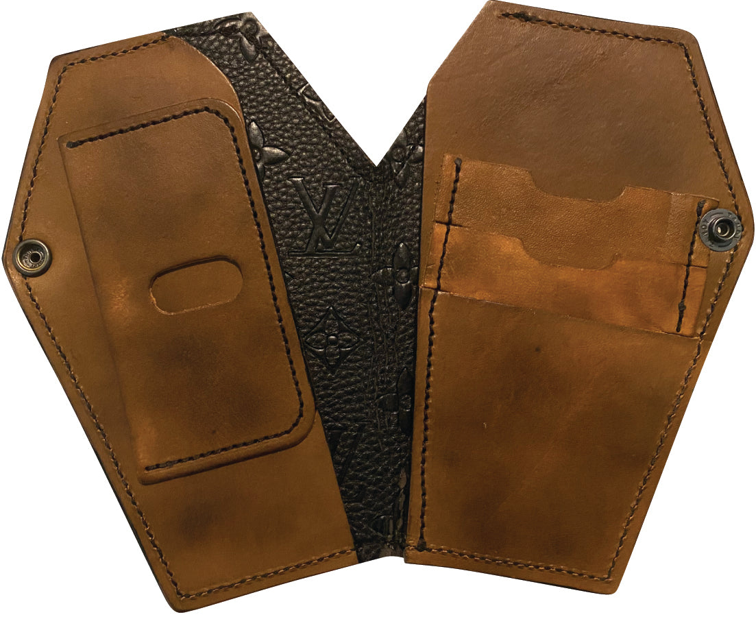 One of one, original. Top quality vegtan leather stained a deep brown and unmatched craftsmanship by our Homies at Old 67. Unreal detail on this piece. LV interior. Built to last and style for days.